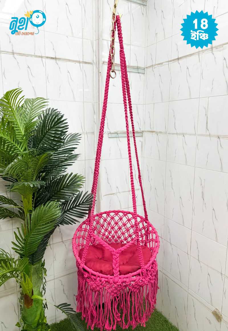 • ধরণ: ম্যাক্রোম হ্যান্ডক্র্যাফটেড চেয়ার দোলনা। • আকার: ১৮ ইঞ্চি (প্রশস্ত সিট)। • উপাদান: উচ্চমানের কটন রোপ এবং শক্তিশালী মেটাল ফ্রেম। • সেট: ১টি দোলনা, ১টি বসার গদি, ঝুলানোর S অ্যাঙ্কর, শিকল ও রয়্যাল বোল্ট।