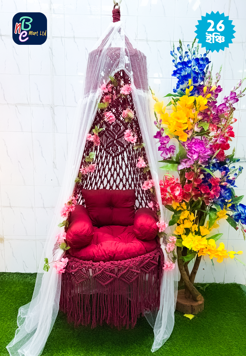 পণ্য বিবরণী: • উপাদান: উচ্চমানের কটন রোপ ও শক্ত লোহার ফ্রেম। • সাইজ: ২৬ ইঞ্চি (বসার স্থান)। • ধরণ: ম্যাক্রোম হ্যান্ডক্র্যাফটেড হ্যাঙ্গিং সুইং। সাথে যা যা থাকছে: ১টি বসার গদি, ২টি সাইড পিলো, ১টি হেড পিলো, ২টি চাইনিজ আর্টিফিশিয়াল ফুল, ১টি মশারি ১টি ঝুলানোর অ্যাঙ্কর, ২ টি রয়েল বোল্ট ও ১টি শিকল