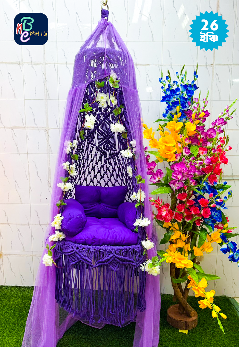 পণ্য বিবরণী: • উপাদান: উচ্চমানের কটন রোপ ও শক্ত লোহার ফ্রেম। • সাইজ: ২৬ ইঞ্চি (বসার স্থান)। • ধরণ: ম্যাক্রোম হ্যান্ডক্র্যাফটেড হ্যাঙ্গিং সুইং। সাথে যা যা থাকছে: ১টি বসার গদি, ২টি সাইড পিলো, ১টি হেড পিলো, ২টি চাইনিজ আর্টিফিশিয়াল ফুল, ১টি মশারি ১টি ঝুলানোর অ্যাঙ্কর, ২ টি রয়েল বোল্ট ও ১টি শিকল