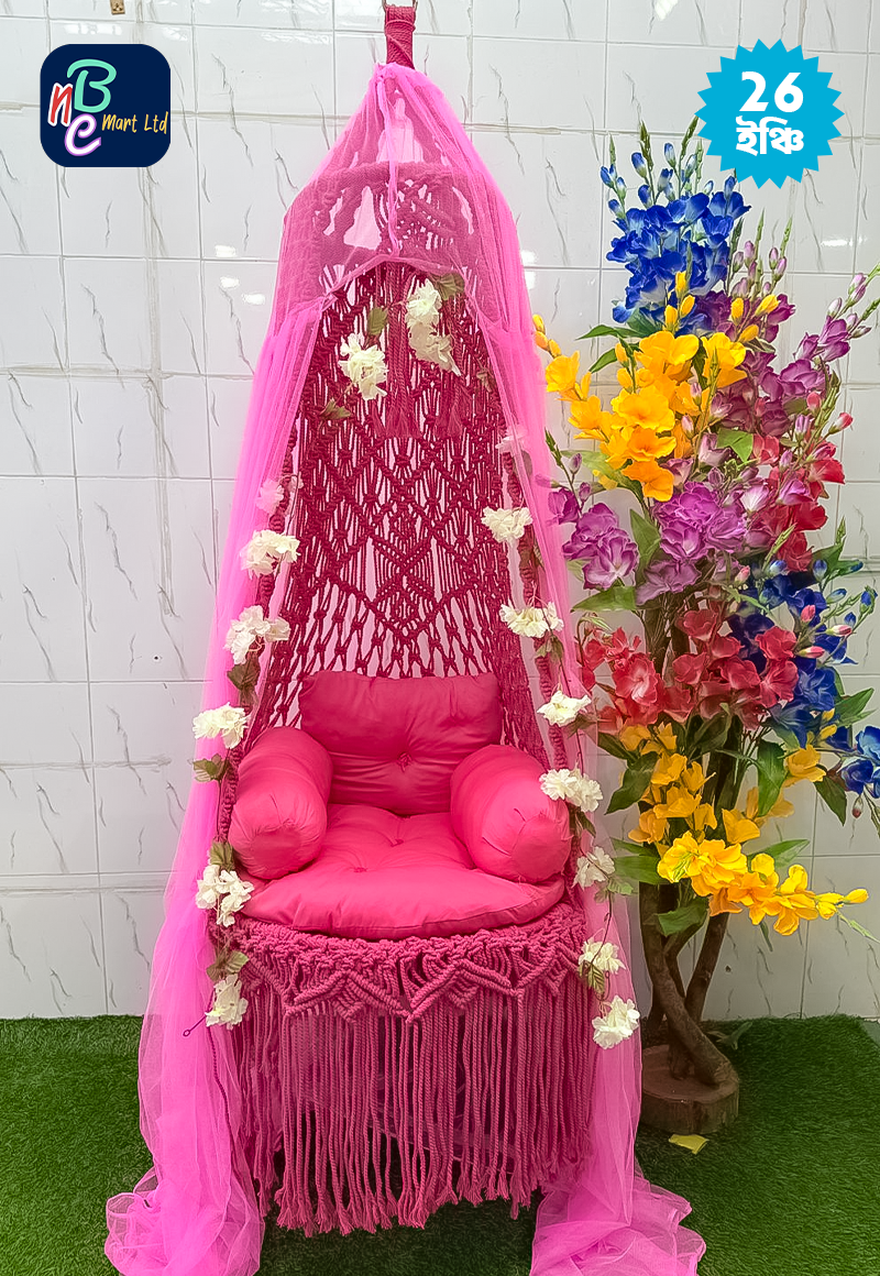 পণ্য বিবরণী: • উপাদান: উচ্চমানের কটন রোপ ও শক্ত লোহার ফ্রেম। • সাইজ: ২৬ ইঞ্চি (বসার স্থান)। • ধরণ: ম্যাক্রোম হ্যান্ডক্র্যাফটেড হ্যাঙ্গিং সুইং। সাথে যা যা থাকছে: ১টি বসার গদি, ২টি সাইড পিলো, ১টি হেড পিলো, ২টি চাইনিজ আর্টিফিশিয়াল ফুল, ১টি মশারি ১টি ঝুলানোর অ্যাঙ্কর, ২ টি রয়েল বোল্ট ও ১টি শিকল