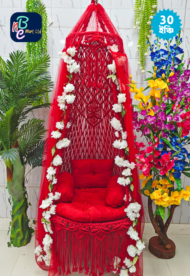 পণ্য বিবরণী: • উপাদান: উচ্চমানের কটন রোপ ও শক্ত লোহার ফ্রেম। • সাইজ: ৩০ ইঞ্চি (বসার স্থান)। • ধরণ: ম্যাক্রোম হ্যান্ডক্র্যাফটেড হ্যাঙ্গিং সুইং। সাথে যা যা থাকছে: ১টি বসার গদি, ২টি সাইড পিলো, ১টি হেড পিলো, ২টি চাইনিজ আর্টিফিশিয়াল ফুল, ১টি মশারি ১টি ঝুলানোর অ্যাঙ্কর, ২ টি রয়েল বোল্ট ও ১টি শিকল