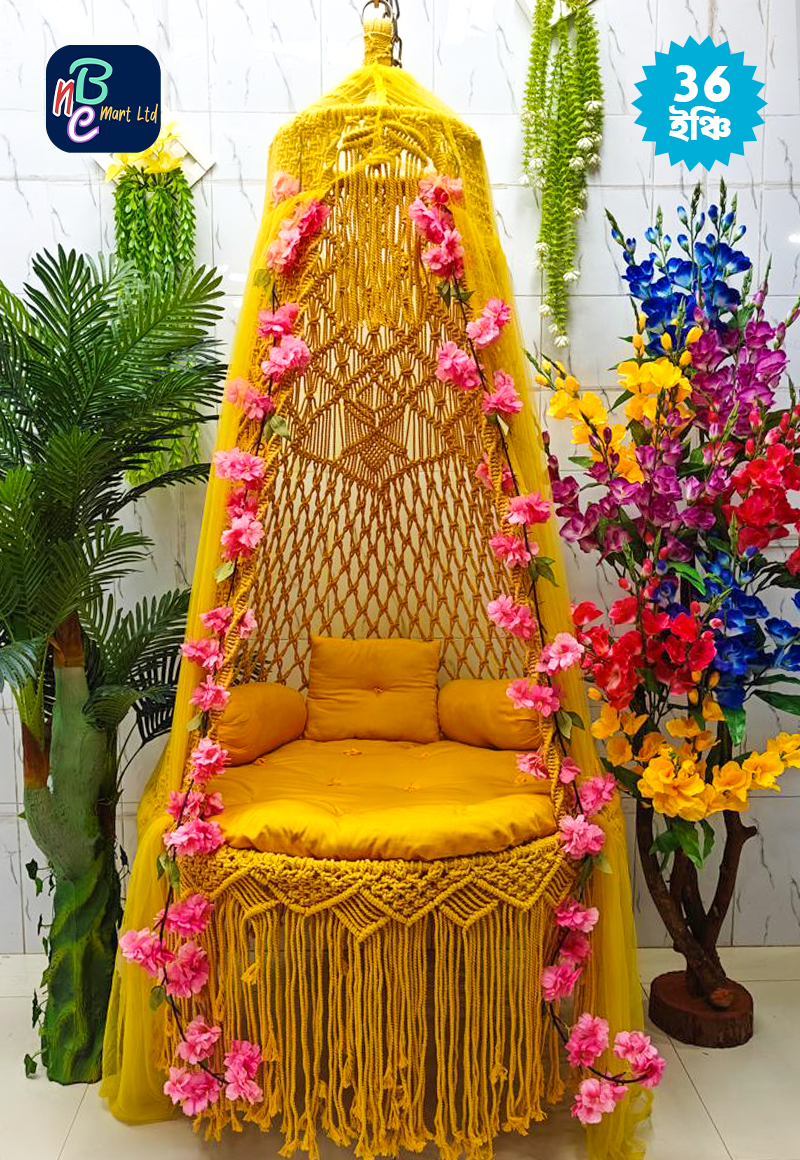 পণ্য বিবরণী: • উপাদান: উচ্চমানের কটন রোপ ও শক্ত লোহার ফ্রেম। • সাইজ: ৩৬ ইঞ্চি (বসার স্থান)। • ধরণ: ম্যাক্রোম হ্যান্ডক্র্যাফটেড হ্যাঙ্গিং সুইং। সাথে যা যা থাকছে: ১টি বসার গদি, ২টি সাইড পিলো, ১টি হেড পিলো, ২টি চাইনিজ আর্টিফিশিয়াল ফুল, ১টি মশারি ১টি ঝুলানোর অ্যাঙ্কর, ২ টি রয়েল বোল্ট ও ১টি শিকল
