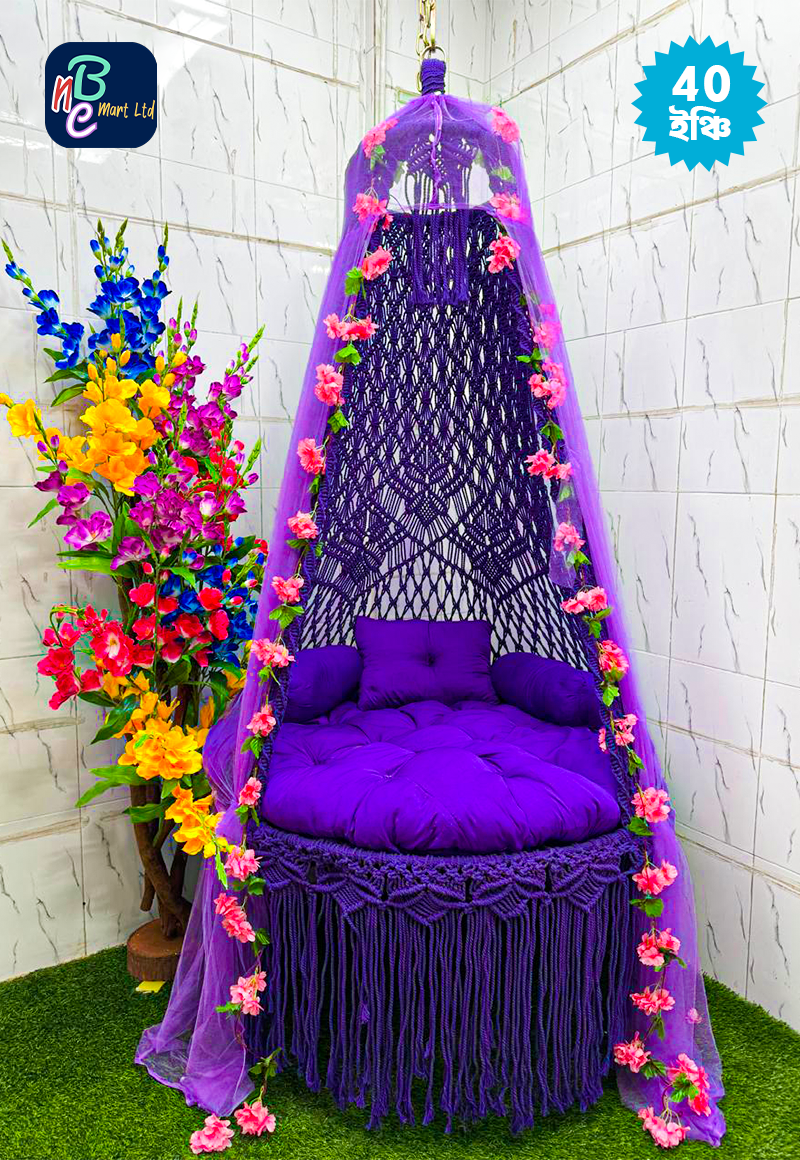 পণ্য বিবরণী: • উপাদান: উচ্চমানের কটন রোপ ও শক্ত লোহার ফ্রেম। • সাইজ: 40 ইঞ্চি (বসার স্থান)। • ধরণ: ম্যাক্রোম হ্যান্ডক্র্যাফটেড হ্যাঙ্গিং সুইং। সাথে যা যা থাকছে: ১টি বসার গদি, ২টি সাইড পিলো, ১টি হেড পিলো, ২টি চাইনিজ আর্টিফিশিয়াল ফুল, ১টি মশারি ১টি ঝুলানোর অ্যাঙ্কর, ২ টি রয়েল বোল্ট ও ১টি শিকল