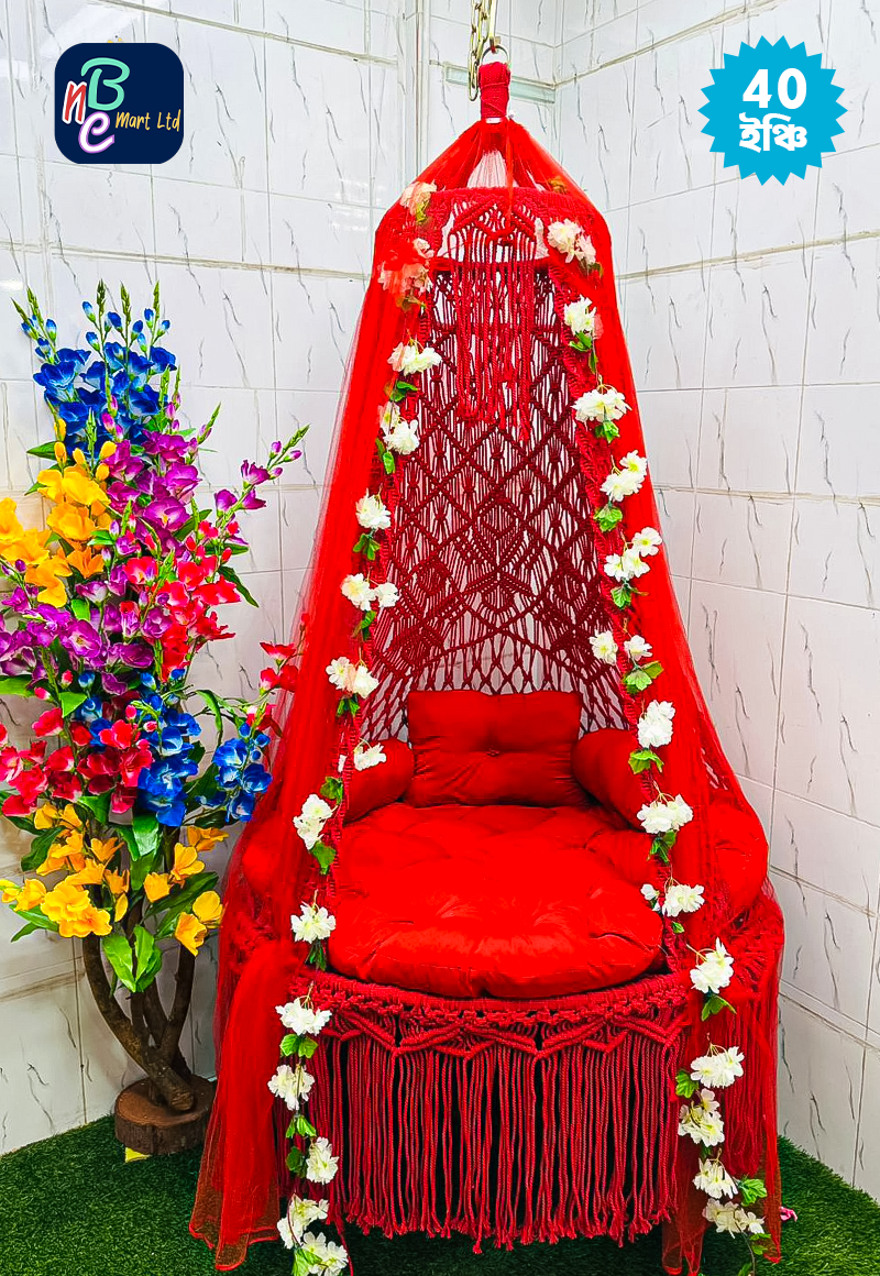 পণ্য বিবরণী: • উপাদান: উচ্চমানের কটন রোপ ও শক্ত লোহার ফ্রেম। • সাইজ: 40 ইঞ্চি (বসার স্থান)। • ধরণ: ম্যাক্রোম হ্যান্ডক্র্যাফটেড হ্যাঙ্গিং সুইং। সাথে যা যা থাকছে: ১টি বসার গদি, ২টি সাইড পিলো, ১টি হেড পিলো, ২টি চাইনিজ আর্টিফিশিয়াল ফুল, ১টি মশারি ১টি ঝুলানোর অ্যাঙ্কর, ২ টি রয়েল বোল্ট ও ১টি শিকল