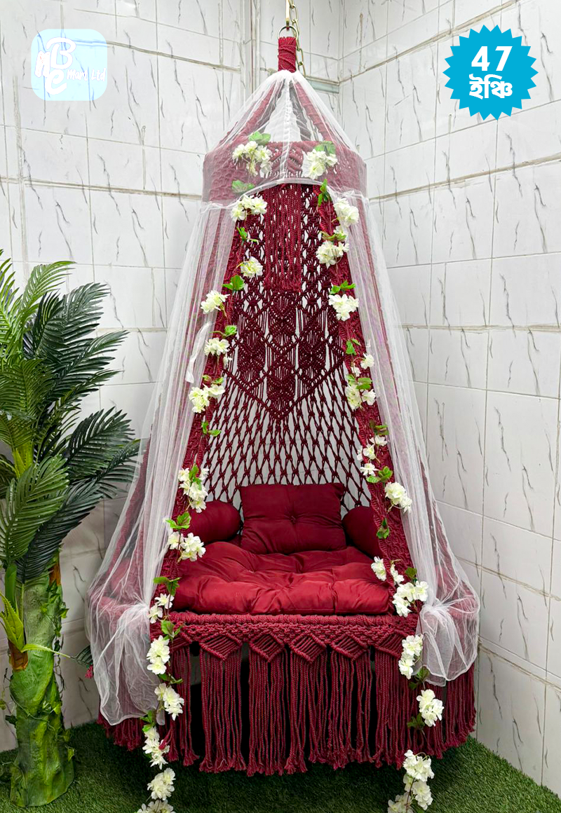 • বিশাল ও প্রশস্ত: ৪৭ ইঞ্চি চওড়া এই দোলনাটিতে সোফার মতো আরাম করে ২ জন অনায়াসে বসতে পারেন। • মজবুত কটন বুনন: ১০০% উন্নত মানের কটন সুতা দিয়ে তৈরি। • সাথে যা যা থাকছে: ১টি বসার গদি, ২টি সাইড পিলো, ১টি হেড পিলো, ২টি চাইনিজ আর্টিফিশিয়াল ফুল, ১টি মশারি ১টি ঝুলানোর অ্যাঙ্কর, রয়েল বোল্ট ও শিকল।