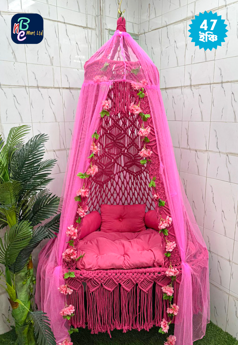 • বিশাল ও প্রশস্ত: ৪৭ ইঞ্চি চওড়া এই দোলনাটিতে সোফার মতো আরাম করে ২ জন অনায়াসে বসতে পারেন। • মজবুত কটন বুনন: ১০০% উন্নত মানের কটন সুতা দিয়ে তৈরি। • সাথে যা যা থাকছে: ১টি বসার গদি, ২টি সাইড পিলো, ১টি হেড পিলো, ২টি চাইনিজ আর্টিফিশিয়াল ফুল, ১টি মশারি ১টি ঝুলানোর অ্যাঙ্কর, রয়েল বোল্ট ও শিকল।